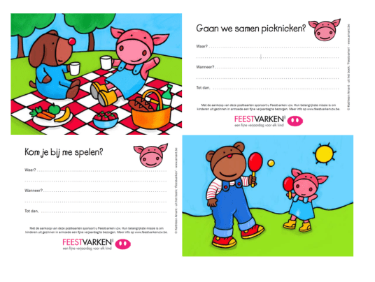 Met deze vrolijke postkaarten, gebaseerd op het boek 'Feestvarken', kan je kind een vriendje uitnodigen om gezellig te gaan picknicken of om te komen spelen.