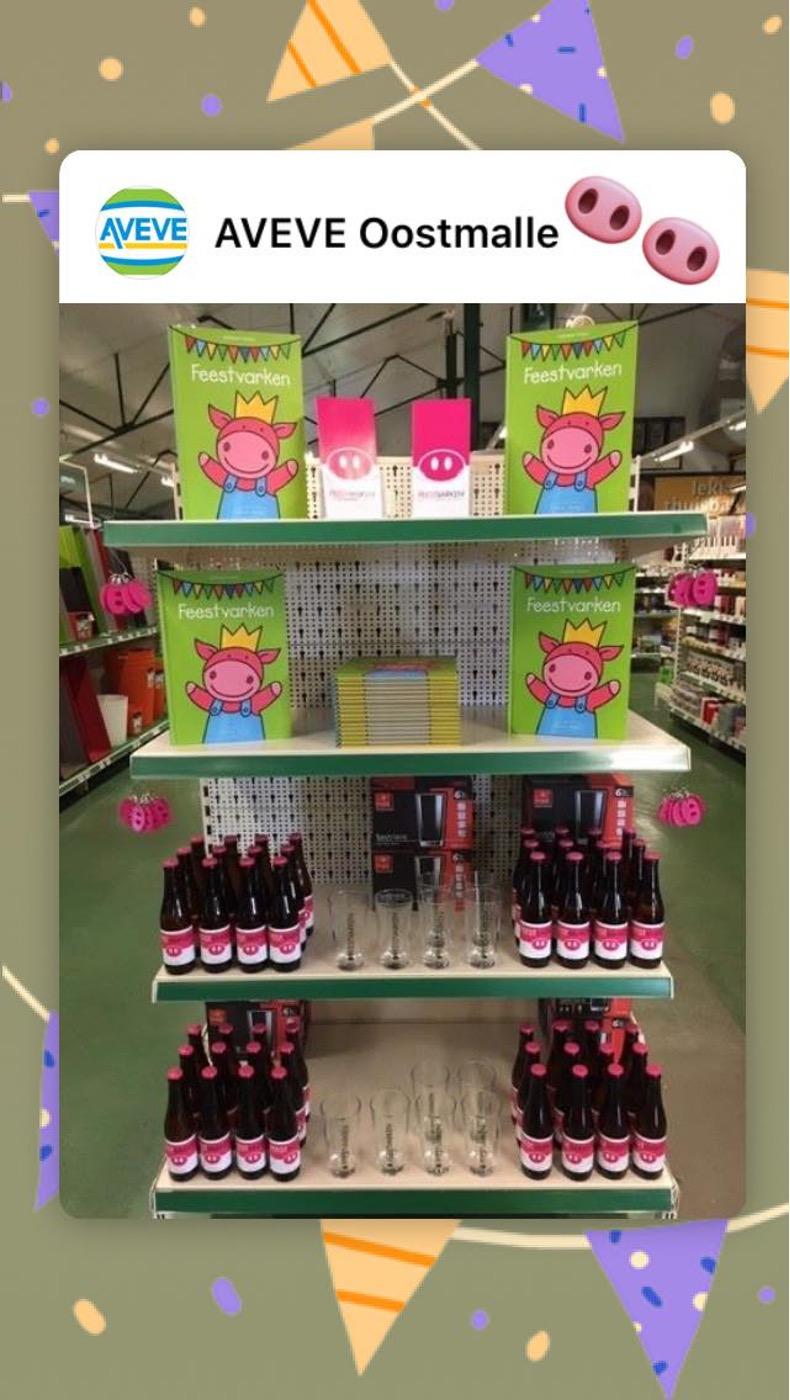 In Aveve Oostmalle & Brecht vind je een Feestvarkenstand waar ze Feestvarkenproducten verkopen en ons in de kijker zetten. Op de dag van de klant gaven ze Feestvarkenbier als geschenkje.